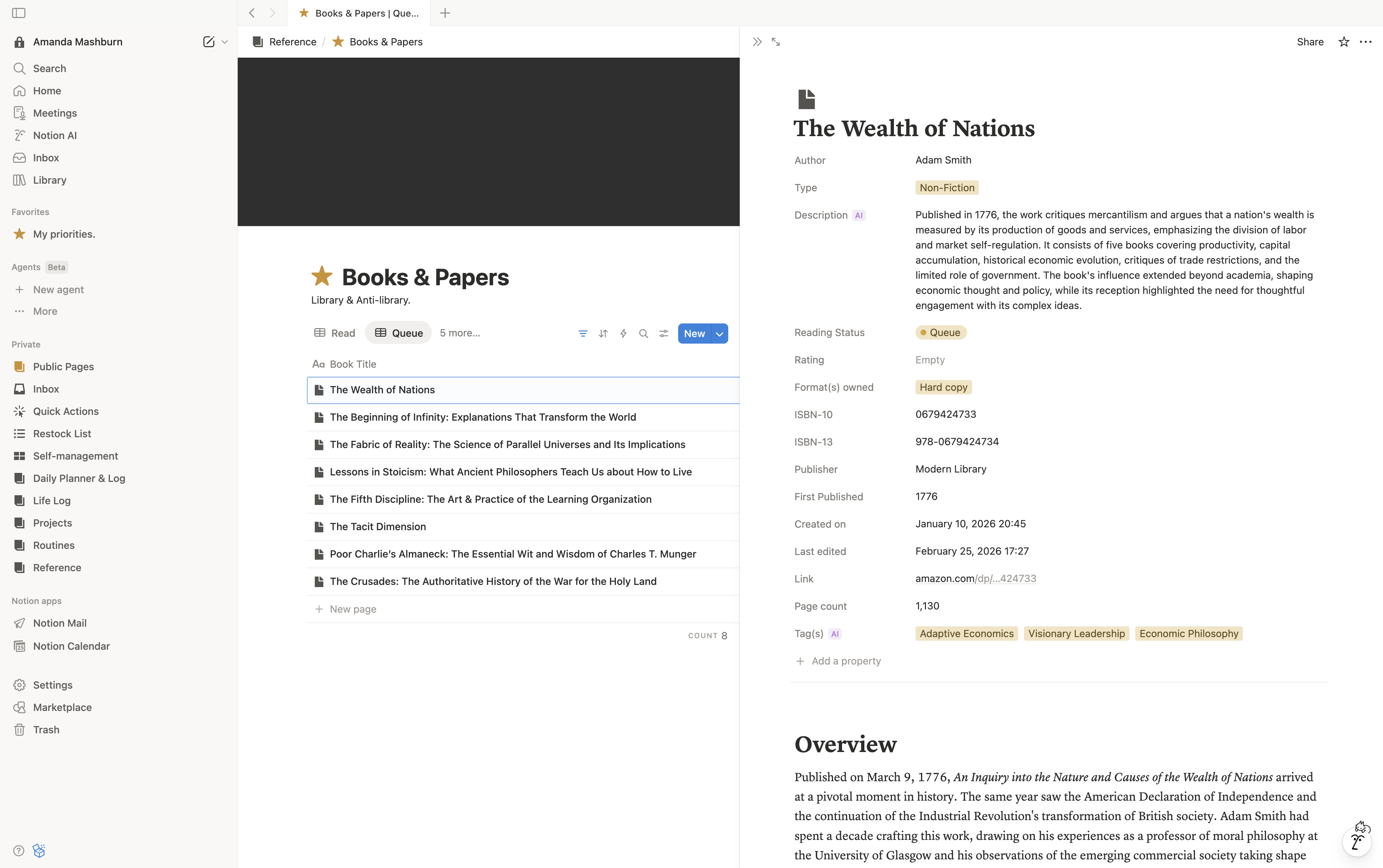 A reading list is where books go to be forgotten. A library catalog is a different thing entirely – it’s a durable, searchable record of everything you own, have read, are reading, and want to read, with enough metadata to make it genuinely useful over time. The Books & Papers collection is one of the few that breaks away from the preference for minimal metadata.What will be covered