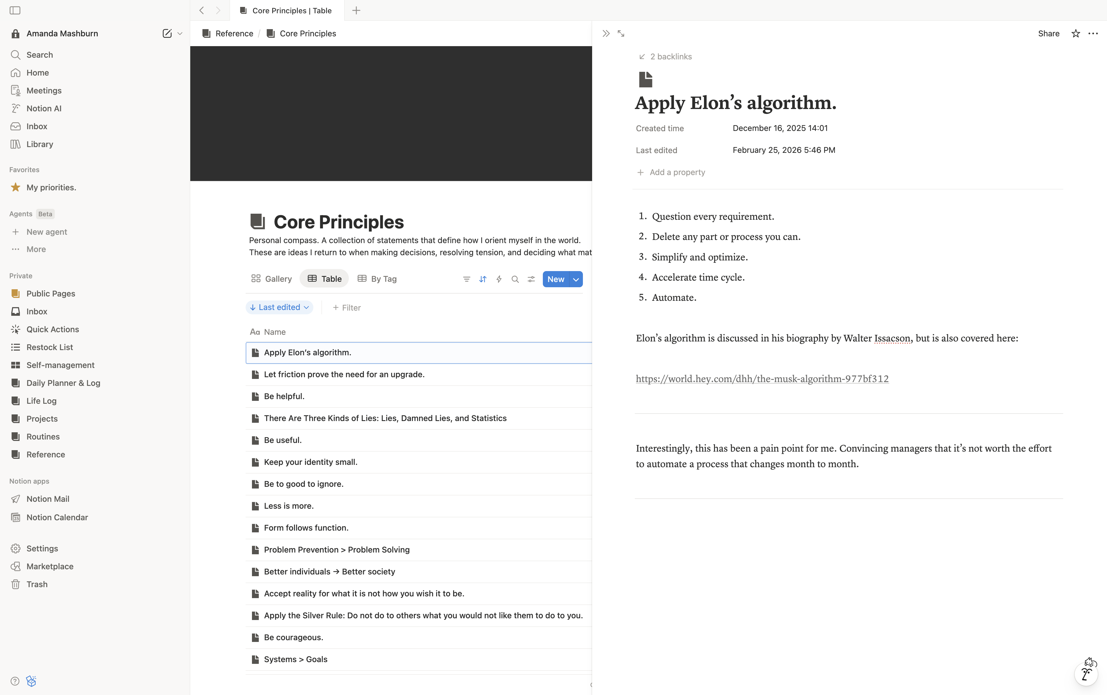 Most people have values. Fewer have articulated them. Even fewer have written them down in a form they can actually reference when it matters. The Core Principles collection is a database of guiding statements – principles, aphorisms, and mental models – each with room to elaborate on the reasoning and context behind it. It’s a living document of how you’ve decided to operate.What will be covered