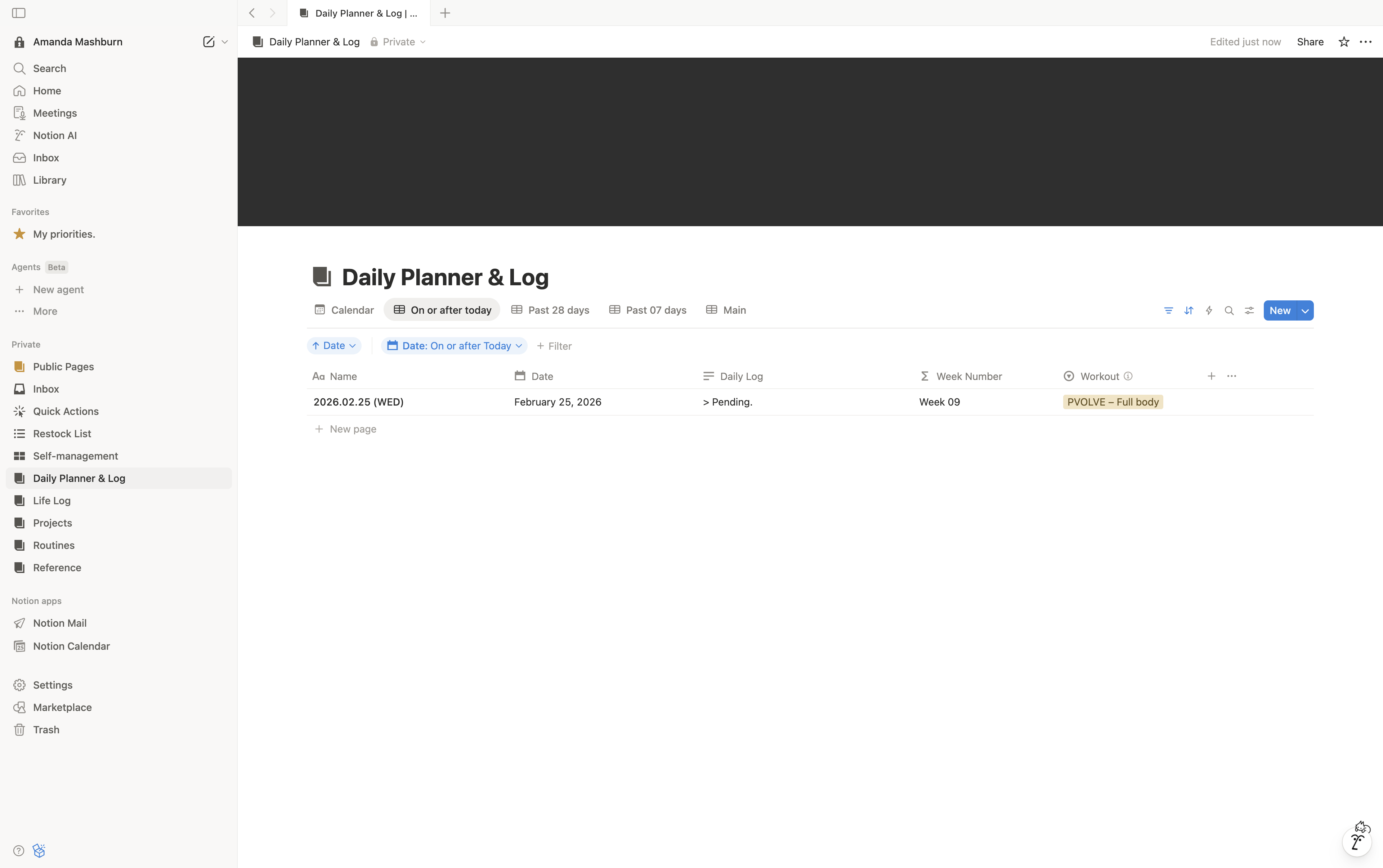 One page per day. Each entry is a single database page named with a consistent date format (e.g.,2026.02.25 (WED)). The naming convention matters: it makes navigation fast, keeps entries sortable, and creates a permanent, searchable record of every day.