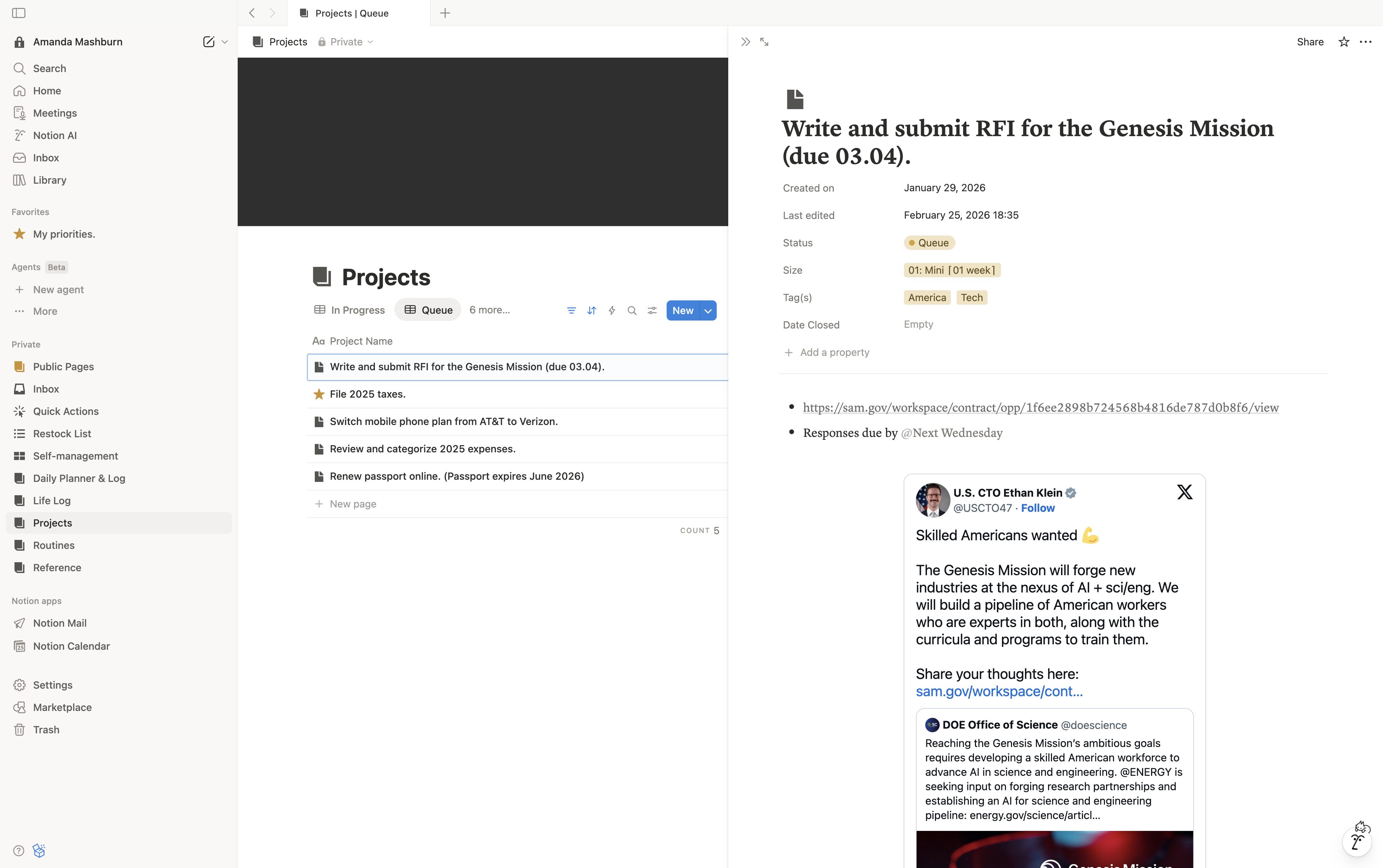 What counts as a project. The distinction between a task and a project matters more than it seems. If it takes more than one action to complete, it belongs here. We’ll cover how to think about scope before you start, and why that changes what you commit to. The sizing system. Projects are assigned a size at the moment of creation, ranging from Micro (roughly 4 hours) to Mega (multi-year). The labels are precise and time-bounded by design – not vague words like “small” or “big,” but actual time ranges that force honest scoping. The project lifecycle. Status moves from Idea bank → Queue → In progress → Closed. Each stage has a purpose. The Idea bank in particular does heavy lifting: it captures projects before you’re ready to act on them, gets the thought out of your head, and preserves everything you’ve researched or noted along the way – without cluttering your active list. Projects as containers. Every project page is a place to accumulate. Links, notes, research, half-formed thoughts – anything related to a project has a home. Nothing gets lost. You can drop something in and trust it’ll be there when you’re ready. Prioritization in context. The Projects list, viewed in full, puts every potential commitment in context with everything else you could do. That context is what makes real prioritization possible. We’ll cover how to use the list to make better decisions about what to take on and when. Tag-based views. Projects are tagged by domain (Health & Wellness, Content Creation, Mashburn Systems LLC, etc.) so you can filter to a specific area of life at a glance. We’ll cover how to structure tags and which views are worth building. Notion implementation. Database setup, properties, views. Obsidian implementation. How to replicate the collection using Bases, including property setup and view configuration.