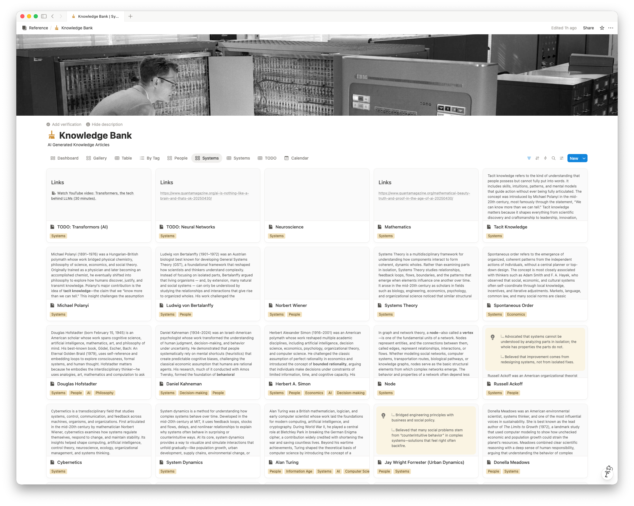 Maintenance: AI-generated or manual update Tags are the workhorse of metadata and a good place to layer AI into your workflow. When you’re starting out, you often don’t know yet what categories you’ll actually need. Tags let you assign labels freely without committing to a formal field structure. Over time, if you find yourself assigning the same type of tag to almost every page in a collection, that’s a sign it might be worth promoting to its own dedicated field. But until that pattern is clear, tags are sufficient. Tags are also useful for edge cases – labels that apply to a handful of pages but not the rest of the collection. You get to capture the category without bloating your metadata fields. And tags reveal cross-collection themes. In my own system, I noticed I was collecting pages related to subtraction and domestic science across my knowledge bank, books, quotes, and general notes – all in separate collections. By tagging those pages consistently, I can build a single view that pulls all of them together, regardless of which collection they live in. Finally – tags and AI work well together. My workflow: I have AI review the page content, the collection context, and my existing tags, then propose relevant labels. I review the suggestions, keep what fits, adjust what doesn’t. It reduces the cognitive load of categorization while making sure I’m not missing an applicable category I would have otherwise overlooked. To recap:- Use tags to guide you toward the attributes that actually matter across a collection.