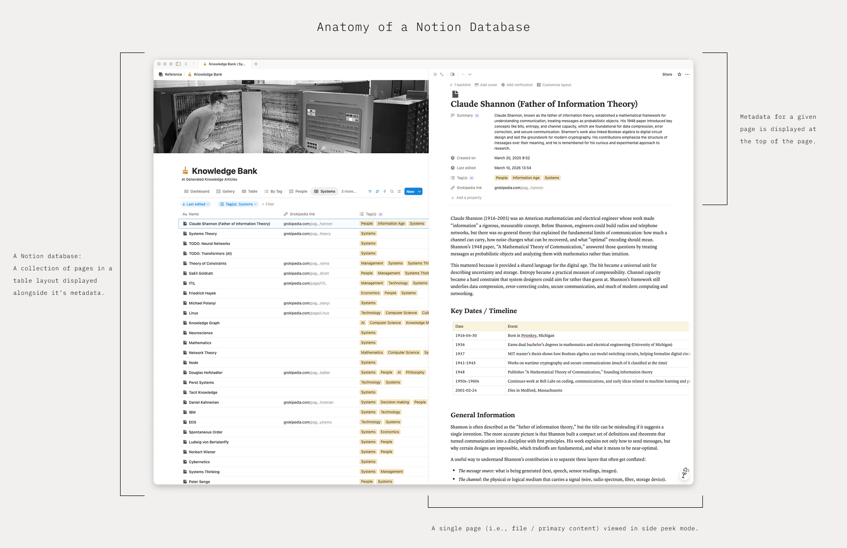 I recommend every database start with one foundational table view: all pages, all metadata, sorted by last edited in descending order to view the entirety of a collection.