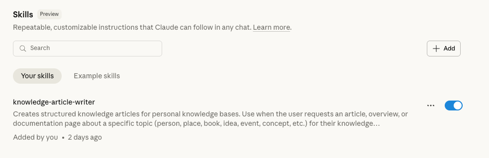 Why not just use Grokipedia? You should. But AI gives you better options for personal learning. Here are the benefits: Tailored content. AI-generated articles use your prompts or skills, structured to your preferences. If you use an LLM with memory (like Claude), articles incorporate your context, language, and mental models. The creation process is interactive—ask follow-ups, request expansions, and incorporate them into the final article. Living documents. Add the initial article, then grow it over time. Link related content, append resources, add new insights as you encounter the topic again. The page evolves with your understanding. Annotation and linking. Highlight text, add notes, and link to other pages in your system. This creates a knowledge graph with pages as nodes and links as edges. Add custom metadata. Make the content yours. Discovery and serendipity. Browsing your collection reveals connections traditional search misses. Re-encountering topics shows how your thinking evolved. Random exploration surfaces unexpected insights. Compounding knowledge. Each article gains value as your graph grows. Cross-referencing deepens. New topics build on existing articles, creating a foundation that accelerates future learning. Personal voice. AI-generated articles match your mental models, use your terminology, and capture why topics matter to you—not just what they are. Knowledge mapping. Pages and links reveal learning patterns and “hot spots” in your interests. Articles integrate with your other notes and projects, mapping your intellectual journey over time. Intellectual record. You’re building a tangible record of your development—potential foundation for future writing, teaching, or content creation. Data loss protection. Websites disappear, paywalls rise, content changes. Your curated knowledge persists.The anatomy of a knowledge article